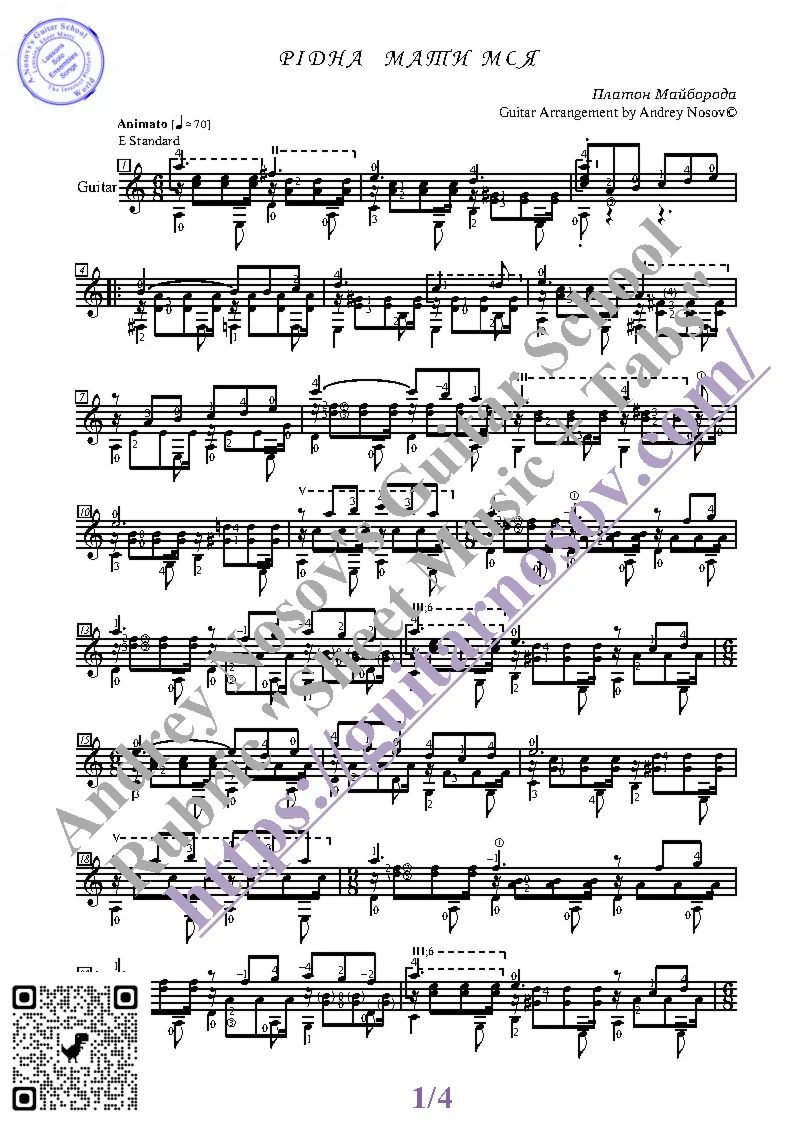 Вашему вниманию предлагается композиция "Рiдна мати моя (П.Майборода)", предназначенная для исполнения на 6-ти струнной гитаре СОЛО. Запись выполнена нотами, сопровождена подробнейшей аппликатурой и продублирована табулатурой. Товар состоит из двух частей (pdf / png*): 1 – Ноты с табулатурой; 2 – Ноты без табулатуры. Прилагается ссылка на скачивание mp3.