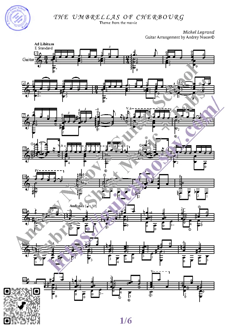 Вашему вниманию предлагается композиция "Les Parapluies de Cherbourg (M.Legrand)", предназначенная для исполнения на 6-ти струнной гитаре СОЛО. Запись выполнена нотами, сопровождена подробнейшей аппликатурой и продублирована табулатурой. Товар состоит из двух частей (pdf / png*): 1 – Ноты с табулатурой; 2 – Ноты без табулатуры. Прилагается ссылка на скачивание mp3.