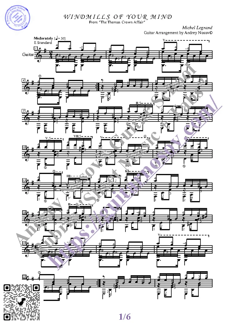 Вашему вниманию предлагается композиция "Windmills of Your Mind (M.Legrand)", предназначенная для исполнения на 6-ти струнной гитаре СОЛО. Запись выполнена нотами, сопровождена подробнейшей аппликатурой и продублирована табулатурой. Товар состоит из двух частей (pdf / png*): 1 – Ноты с табулатурой; 2 – Ноты без табулатуры. Прилагается ссылка на скачивание mp3.