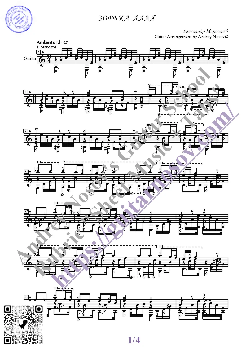 Вашему вниманию предлагается композиция "Зорька алая (А.Морозов)", предназначенная для исполнения на 6-ти струнной гитаре СОЛО. Запись выполнена нотами, сопровождена подробнейшей аппликатурой и продублирована табулатурой. Товар состоит из двух частей (pdf / png*): 1 – Ноты с табулатурой; 2 – Ноты без табулатуры. Прилагается ссылка на скачивание mp3.