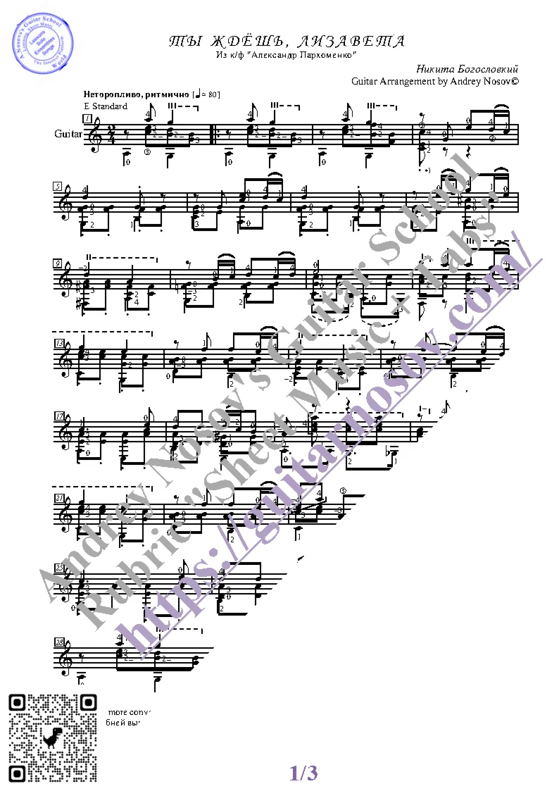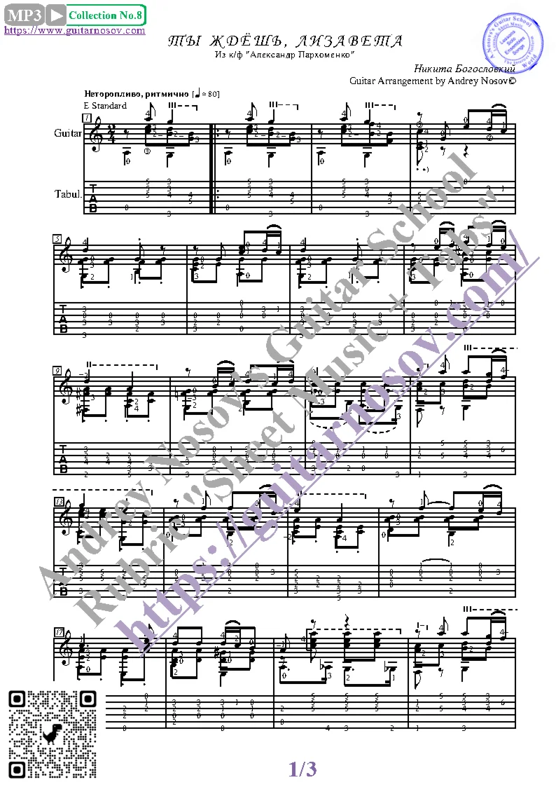 Вашему вниманию предлагается композиция "Ты ждёшь, Лизавета (Н.Богословский)", предназначенная для исполнения на 6-ти струнной гитаре СОЛО. Запись выполнена нотами, сопровождена подробнейшей аппликатурой и продублирована табулатурой. Товар состоит из двух частей (pdf / png*): 1 – Ноты с табулатурой; 2 – Ноты без табулатуры. Прилагается ссылка на скачивание mp3.