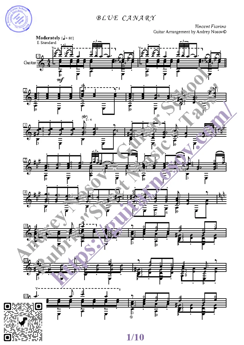 Вашему вниманию предлагается композиция "Blue Canary (V.Fiorino)", предназначенная для исполнения на 6-ти струнной гитаре СОЛО. Запись выполнена нотами, сопровождена подробнейшей аппликатурой и продублирована табулатурой. Товар состоит из двух частей (pdf / png*): 1 – Ноты с табулатурой; 2 – Ноты без табулатуры. Прилагается ссылка на скачивание mp3.