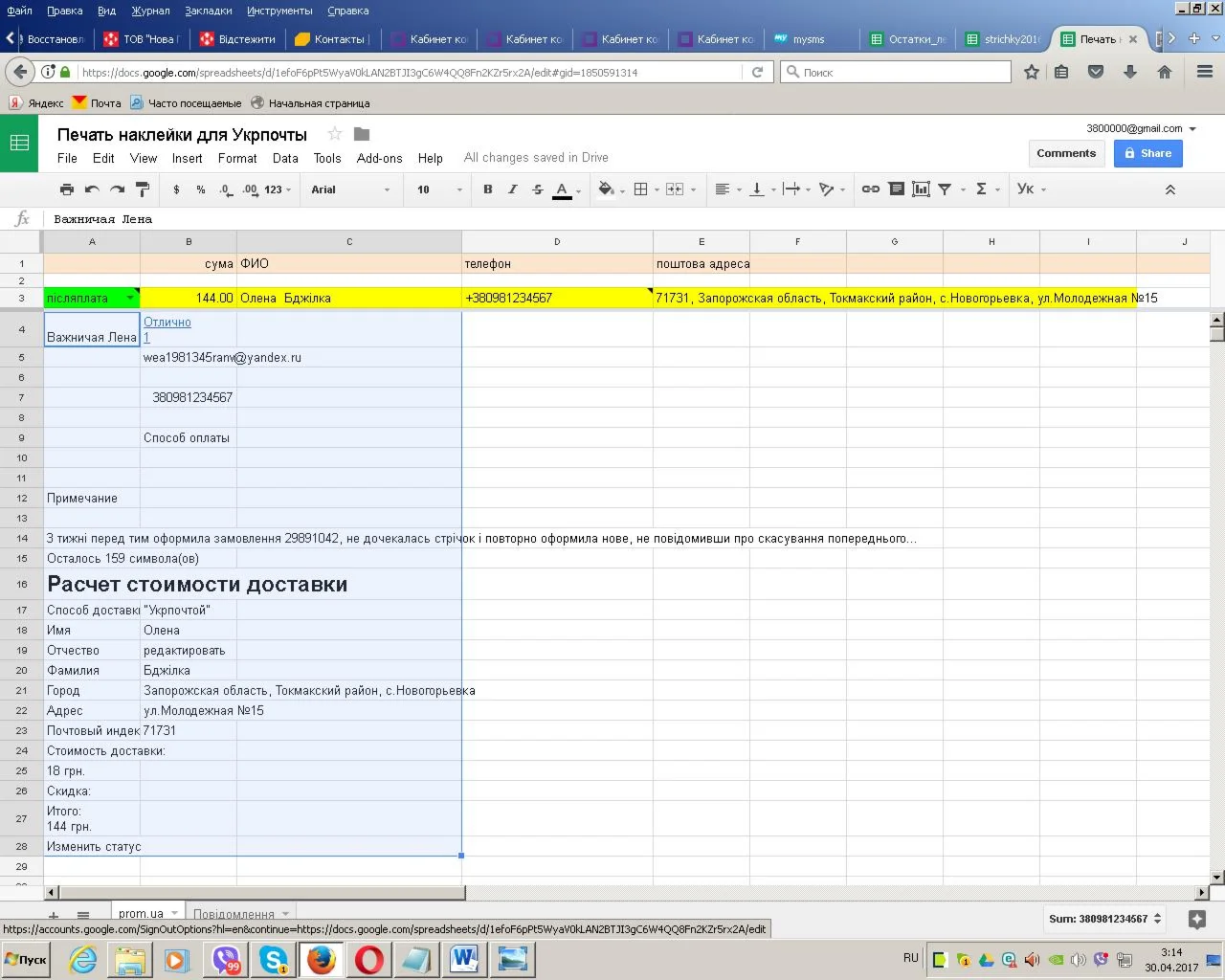 Продавцы товаров на портале prom.ua могут сократить ручной труд заполнения данных для отправки посылок "Укрпочтой" до минимума. Время создания наклейки для посылки и сопроводительного бланка (его оформление занимало ранее до 10-ти минут) можно сократить до 10-ти секунд и исключить возможные ошибки при переносе информации. Все, что нужно - скопировать с карточки заказа покупателя (Заказ №...) на портале prom.ua часть информации с адресом покупателя, суммой заказа (выделяется мышкой фрагмент страницы) и вставить в google-sheets документ, выбрать, с наложенным платежем или без, и распечатать готовый результат: "Супровiдна адреса до посилки" (Сума оголошеної цiнностi, Сума пiсляплати (цифрами та прописом), адреса відправника, одержувача (адресата)). Все данные о покупателе, скопированные в браузере с портала, сортируются с помощью формул, прописанных в файле google-sheets и автоматически заносятся в нужные графы сопроводительного бланка для посылки. Вам будет предоставлена ссылка на файл google-sheets - перейдите по данной ссылке и создайте копию ("File" -> "Make a copy...") - он сохранится в Вашем аккаунте сервиса Google и Вы сможете его редактировать (вносить информацию с заказов на портале prom.ua для распечатки наклеек на посылки с сопроводительным документом.