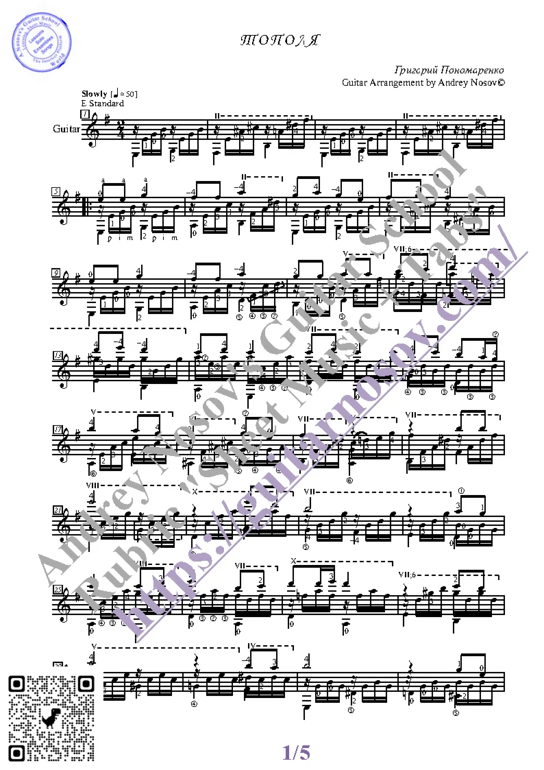 Вашему вниманию предлагается композиция "Тополя (Г.Пономаренко)", предназначенная для исполнения на 6-ти струнной гитаре СОЛО. Запись выполнена нотами, сопровождена подробнейшей аппликатурой и продублирована табулатурой. Товар состоит из двух частей (pdf / png*): 1 – Ноты с табулатурой; 2 – Ноты без табулатуры. Прилагается ссылка на скачивание mp3.