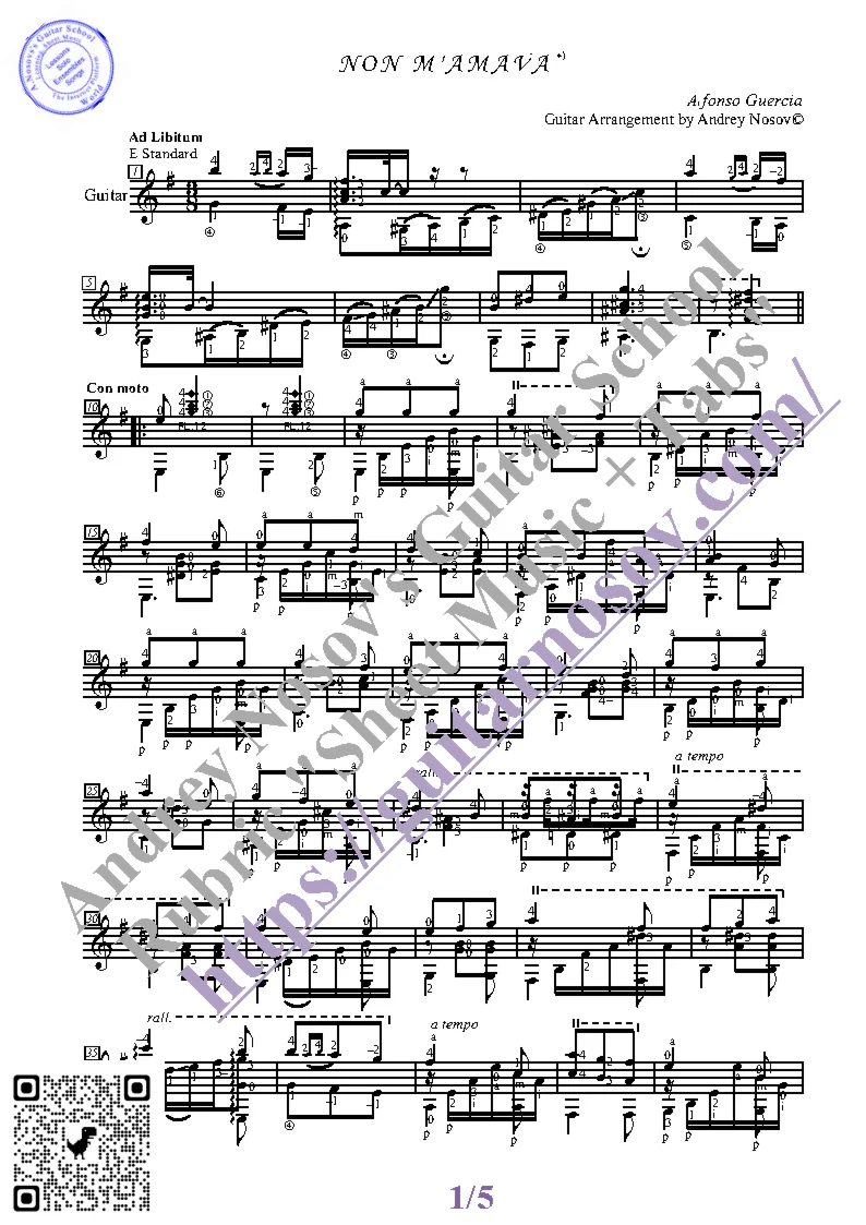 Вашему вниманию предлагается композиция "No, He Did Not Like (A.Guerchia)", предназначенная для исполнения на 6-ти струнной гитаре СОЛО. Запись выполнена нотами, сопровождена подробнейшей аппликатурой и продублирована табулатурой. Товар состоит из двух частей (pdf / png*): 1 – Ноты с табулатурой; 2 – Ноты без табулатуры. Прилагается ссылка на скачивание mp3.