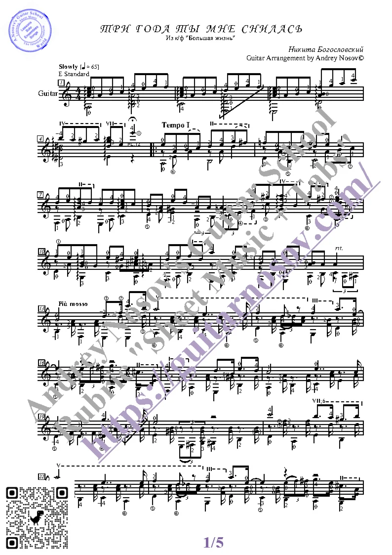 Вашему вниманию предлагается композиция "Три года ты мне снилась (Н.Богословский)", предназначенная для исполнения на 6-ти струнной гитаре СОЛО. Запись выполнена нотами, сопровождена подробнейшей аппликатурой и продублирована табулатурой. Товар состоит из двух частей (pdf / png*): 1 – Ноты с табулатурой; 2 – Ноты без табулатуры. Прилагается ссылка на скачивание mp3.