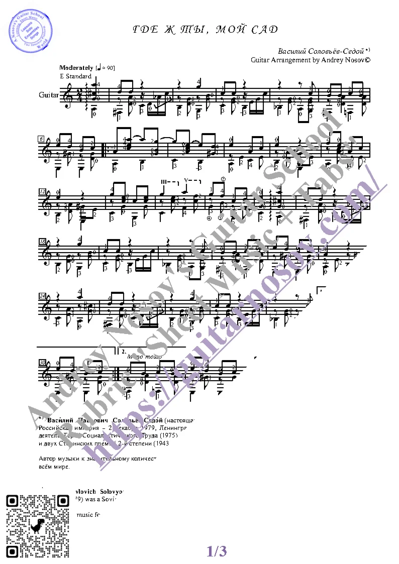 Вашему вниманию предлагается композиция "Где ж ты, мой сад (В.Соловьёв-Седой)", предназначенная для исполнения на 6-ти струнной гитаре СОЛО. Запись выполнена нотами, сопровождена подробнейшей аппликатурой и продублирована табулатурой. Товар состоит из двух частей (pdf / png*): 1 – Ноты с табулатурой; 2 – Ноты без табулатуры. Прилагается ссылка на скачивание mp3.