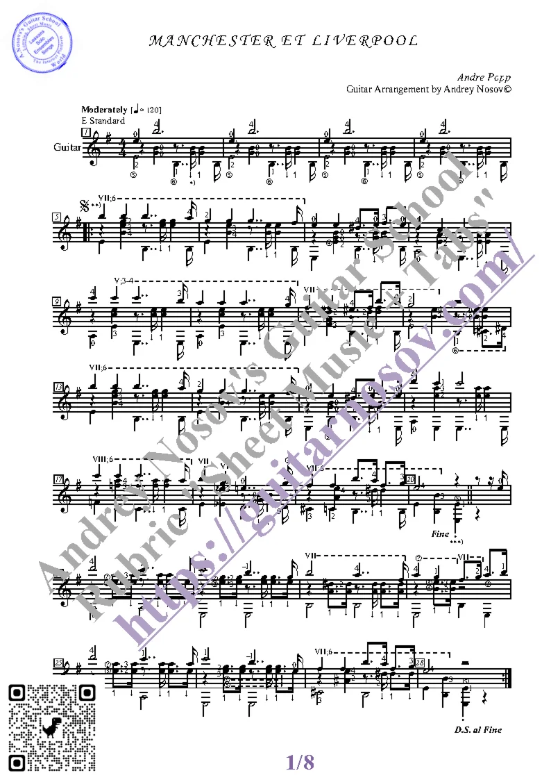 Вашему вниманию предлагается композиция "Manchester et Liverpool (A.Popp)", предназначенная для исполнения на 6-ти струнной гитаре СОЛО. Запись выполнена нотами, сопровождена подробнейшей аппликатурой и продублирована табулатурой. Товар состоит из двух частей (pdf / png*): 1 – Ноты с табулатурой; 2 – Ноты без табулатуры. Прилагается ссылка на скачивание mp3.