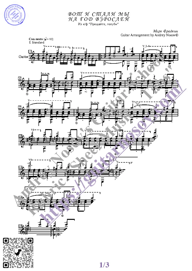 Вашему вниманию предлагается композиция "Вот и стали мы на год взрослей (М.Фрадкин)", предназначенная для исполнения на 6-ти струнной гитаре СОЛО. Запись выполнена нотами, сопровождена подробнейшей аппликатурой и продублирована табулатурой. Товар состоит из двух частей (pdf / png*): 1 – Ноты с табулатурой; 2 – Ноты без табулатуры. Прилагается ссылка на скачивание mp3.