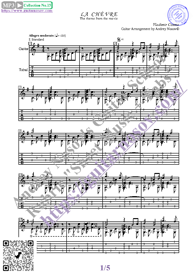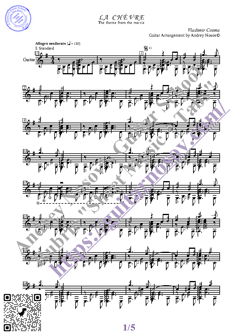 Вашему вниманию предлагается композиция "La Chèvre (V.Cosma)", предназначенная для исполнения на 6-ти струнной гитаре СОЛО. Запись выполнена нотами, сопровождена подробнейшей аппликатурой и продублирована табулатурой. Товар состоит из двух частей (pdf / png*): 1 – Ноты с табулатурой; 2 – Ноты без табулатуры. Прилагается ссылка на скачивание mp3.