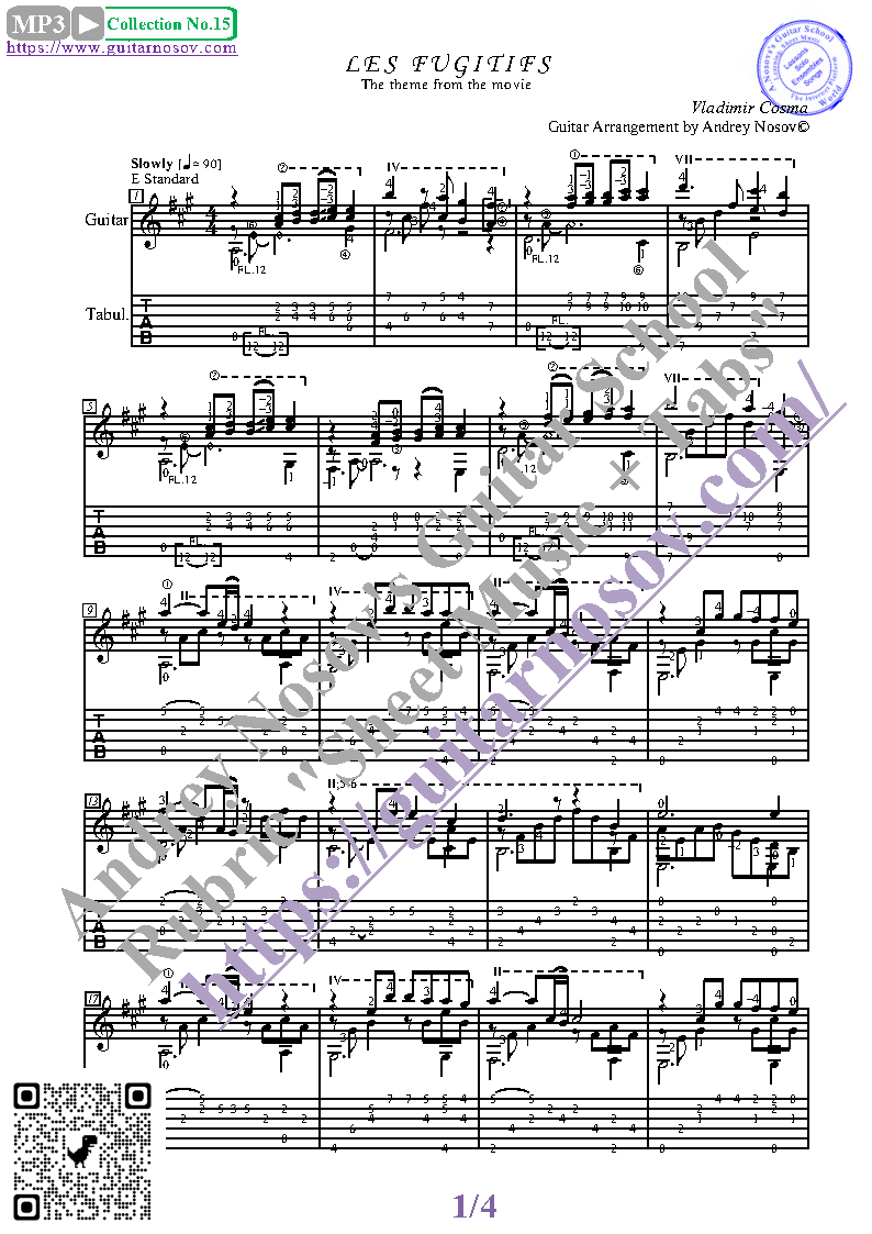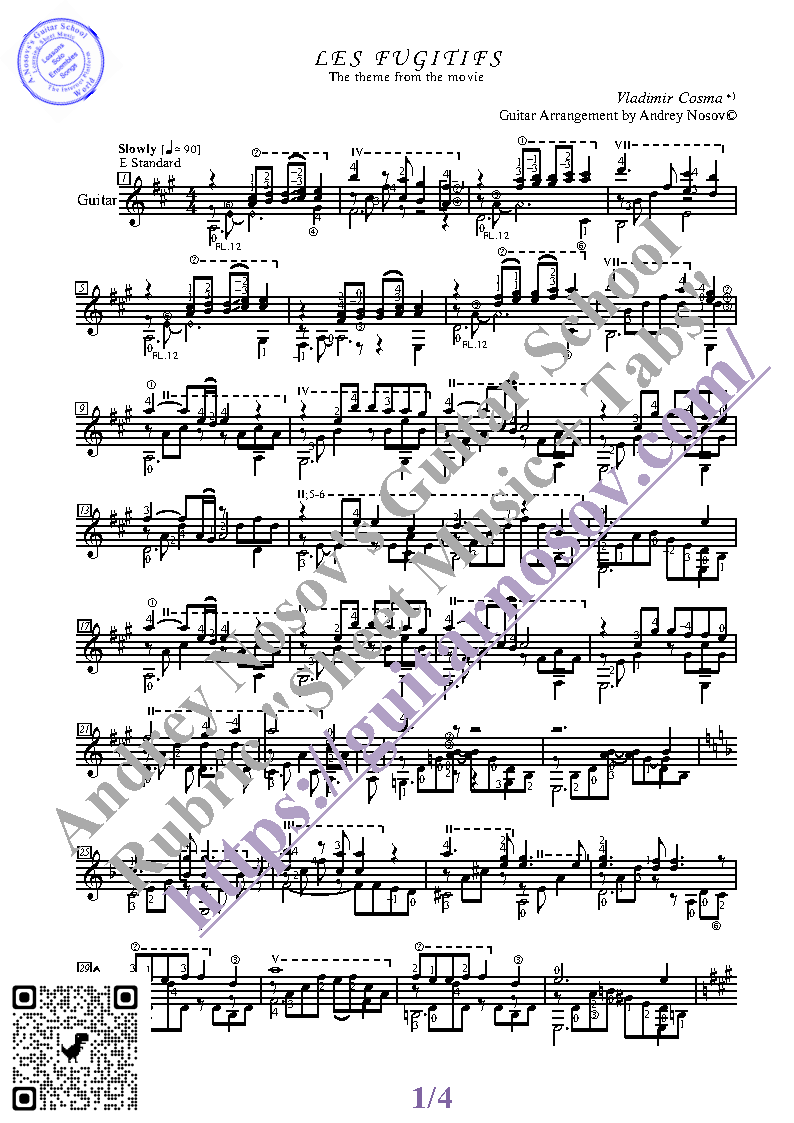 Вашему вниманию предлагается композиция "Les Fugitifs (V.Cosma)", предназначенная для исполнения на 6-ти струнной гитаре СОЛО. Запись выполнена нотами, сопровождена подробнейшей аппликатурой и продублирована табулатурой. Товар состоит из двух частей (pdf / png*): 1 – Ноты с табулатурой; 2 – Ноты без табулатуры. Прилагается ссылка на скачивание mp3.