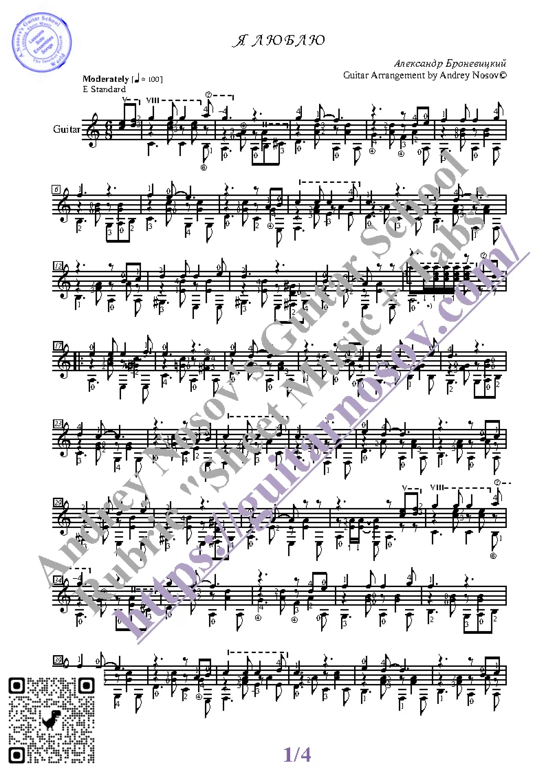 Вашему вниманию предлагается композиция "Я люблю (А.Броневицкий)", предназначенная для исполнения на 6-ти струнной гитаре СОЛО. Запись выполнена нотами, сопровождена подробнейшей аппликатурой и продублирована табулатурой. Товар состоит из двух частей (pdf / png*): 1 – Ноты с табулатурой; 2 – Ноты без табулатуры. Прилагается ссылка на скачивание mp3.