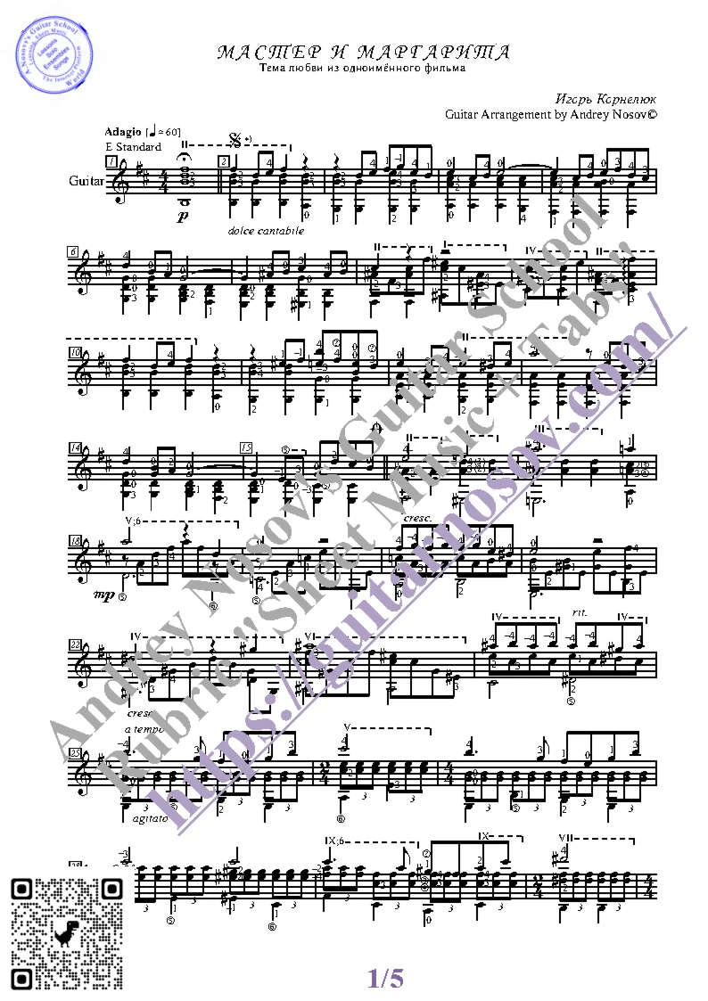Вашему вниманию предлагается композиция "Мастер и Маргарита, тема любви (И.Корнелюк)", предназначенная для исполнения на 6-ти струнной гитаре СОЛО. Запись выполнена нотами, сопровождена подробнейшей аппликатурой и продублирована табулатурой. Товар состоит из двух частей (pdf / png*): 1 – Ноты с табулатурой; 2 – Ноты без табулатуры. Прилагается ссылка на скачивание mp3.