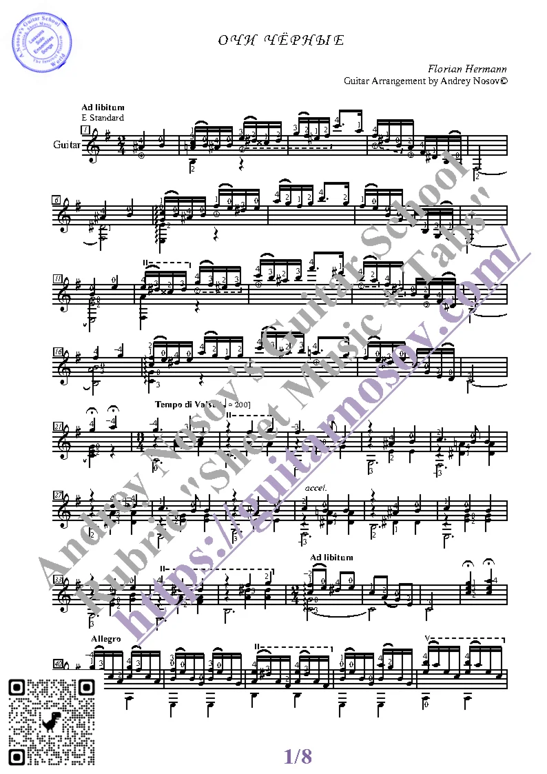 Вашему вниманию предлагается композиция "Очи чёрные (Ф.Герман)", предназначенная для исполнения на 6-ти струнной гитаре СОЛО. Запись выполнена нотами, сопровождена подробнейшей аппликатурой и продублирована табулатурой. Товар состоит из двух частей (pdf / png*): 1 – Ноты с табулатурой; 2 – Ноты без табулатуры. Прилагается ссылка на скачивание mp3.