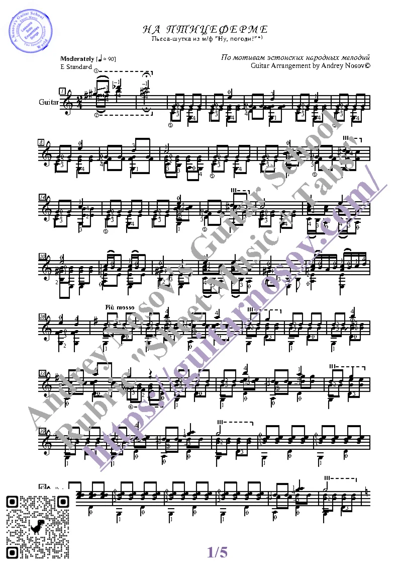 Вашему вниманию предлагается композиция "На птицеферме (По мотивам эстонских народных песен)", предназначенная для исполнения на 6-ти струнной гитаре СОЛО. Запись выполнена нотами, сопровождена подробнейшей аппликатурой и продублирована табулатурой. Товар состоит из двух частей (pdf / png*): 1 – Ноты с табулатурой; 2 – Ноты без табулатуры. Прилагается ссылка на скачивание mp3.