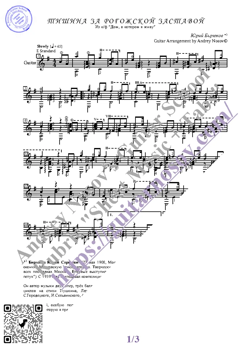 Вашему вниманию предлагается композиция "Тишина за Рогожской заставой (Ю.Бирюков)", предназначенная для исполнения на 6-ти струнной гитаре СОЛО. Запись выполнена нотами, сопровождена подробнейшей аппликатурой и продублирована табулатурой. Товар состоит из двух частей (pdf / png*): 1 – Ноты с табулатурой; 2 – Ноты без табулатуры. Прилагается ссылка на скачивание mp3.