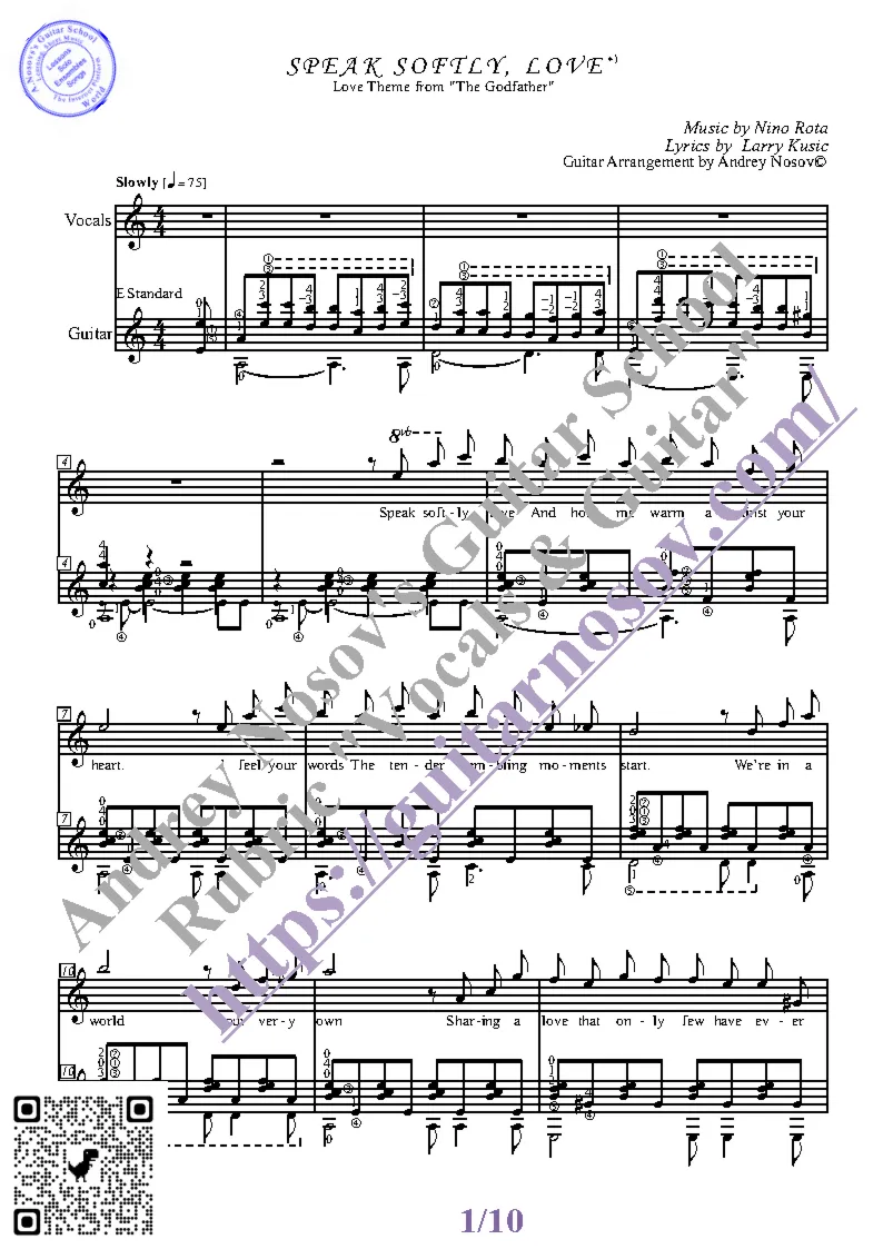 Вашему вниманию предлагается композиция "Speak Softly Love (mus.N.Rota, lir.L.Kusic)", предназначенная для вокала в сопровождении 6-ти струнной гитары. Запись выполнена нотами и включает в себя партию вокала с подтекстовкой, партию гитары с подробнейшей аппликатурой и текст песни (НА АНГЛИЙСКОМ). Партия гитары продублирована табулатурой. Товар состоит из двух частей: 1 – Ноты с табулатурой; 2 – Ноты без табулатуры (в одном PDF). Прилагается ссылка на прослушивание / скачивание mp3.