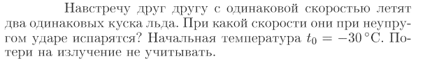 Навстречу друг другу с одинаковой скоростью летят два одинаковых куска льда. При какой скорости они при неупругом ударе испарятся? Начальная температура t0=— 30 °С. Потери на излучение не учитывать.