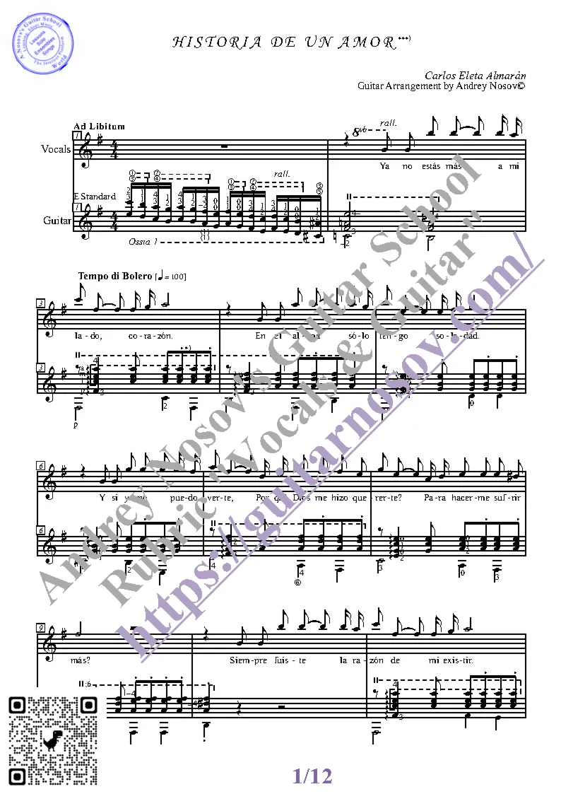 Вашему вниманию предлагается композиция "Historia De Un Amor (C.Almaran)", предназначенная для вокала в сопровождении 6-ти струнной гитары. Запись выполнена нотами и включает в себя партию вокала с подтекстовкой, партию гитары с подробнейшей аппликатурой и текст песни (НА ИСПАНСКОМ). Партия гитары продублирована табулатурой. Товар состоит из двух частей: 1 – Ноты с табулатурой; 2 – Ноты без табулатуры (в одном PDF). Прилагается ссылка на прослушивание / скачивание mp3.