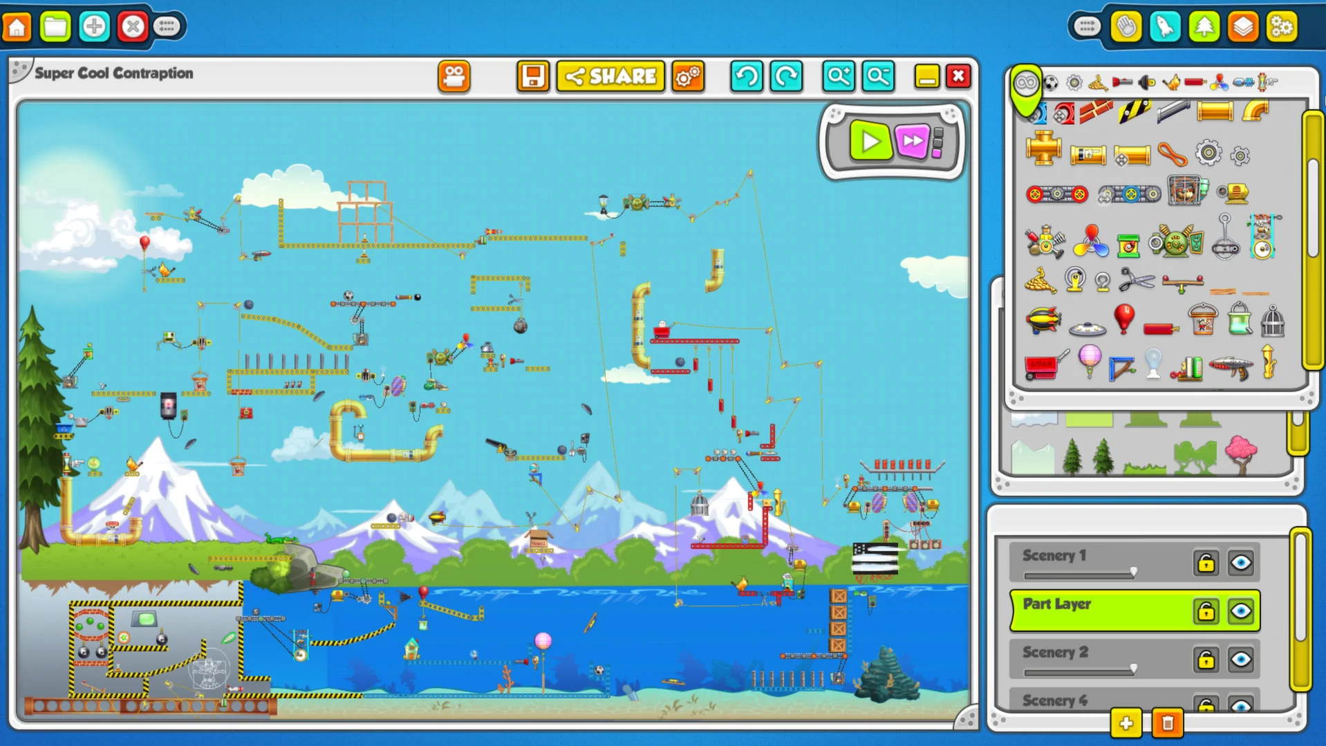 Увлекательная забава ориентирована на всяческое взаимодействие определенных предметов между собой с целью достижения желаемой цели.Contraption Maker (2014) РС обладает удивительным разнообразием, включает в себя более чем сотню уровней и поражающий воображение список предлагаемых предметов, где в действие может пойти все, что только отыщет игрок. Перечисление доступных предметов могло бы занять не один час, все они совершенно разнотипны и имеют различное предназначение и характеристики.Игра Contraption Maker (2014) РС имеет вполне качественный редактор, что способен создавать свои собственные головоломки.Каждый из уровней этих физических головоломок, слегка схож с «безумным фейерверком» весьма неординарных загадок.