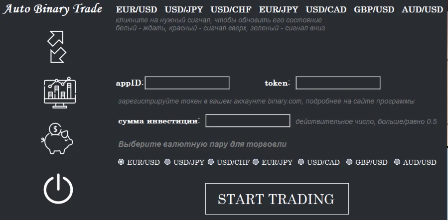 Наша программа позволит вам максимально быстро получать сигналы, предоставляемые сайтом binary-signal.com и совершать сделки по выбранным валютным парам по направлению сигнала.