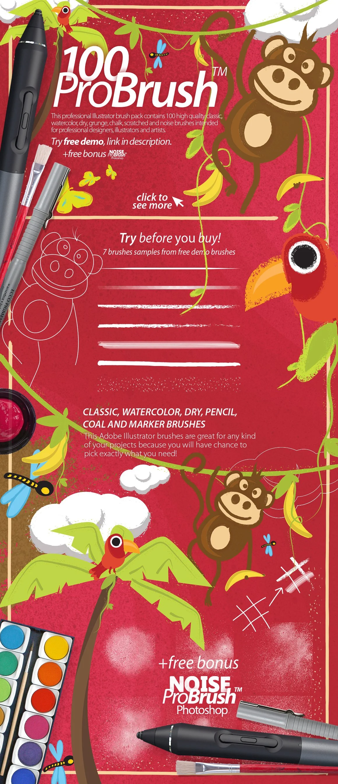 This professional Illustrator brush BUNDLE contains 1730 high quality classic, ink, brush, pencil, coal, pastels, flowmaster and many other brushes from 30 BRUSH packs intended for professional designers, illustrators and artists.