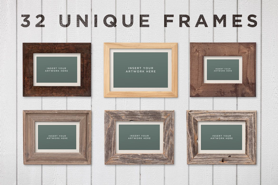 This picture frame mockup kit contains 32 unique frames, 20 different background textures, and is fully customizable.