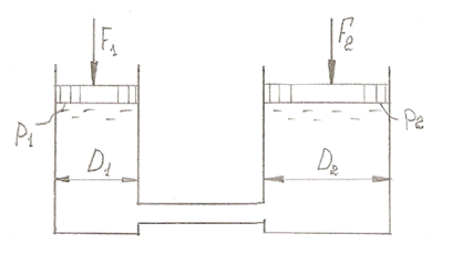 В цилиндрах гидравлического пресса поршни диаметром D1 и D2 находятся в покое. На поршни действуют силы F1 и F2 (см. рисунок 1).