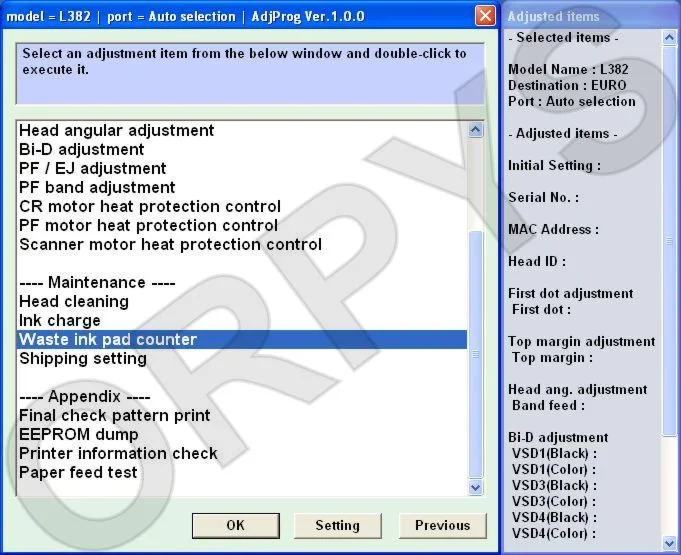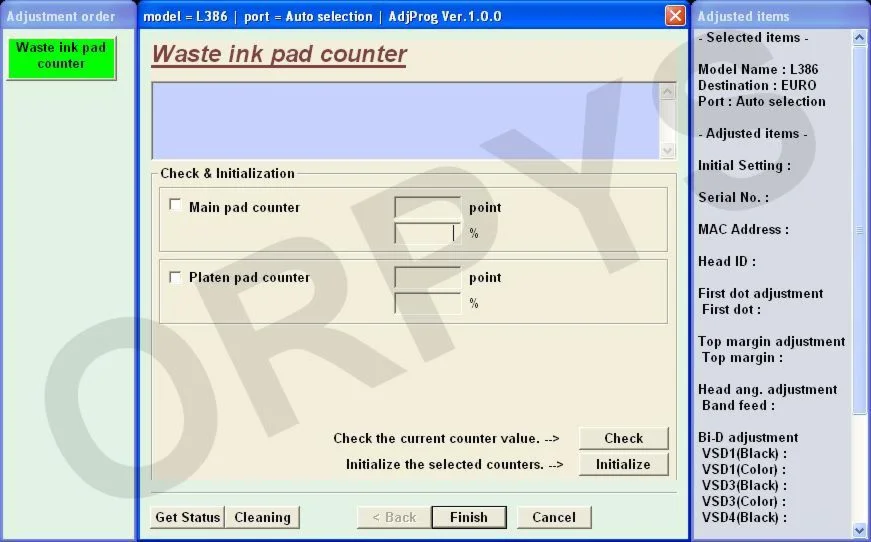 Epson L382, L386, L486 (EURO, CIS) Ver.1.0.0 Service Adjustment Program — это сервисная программа для указанных моделей принтеров, программа позволяет сбросить счетчик памперса (абсорбер), прописывать ID печатающей головки, делать инициализацию принтера и другие функции.