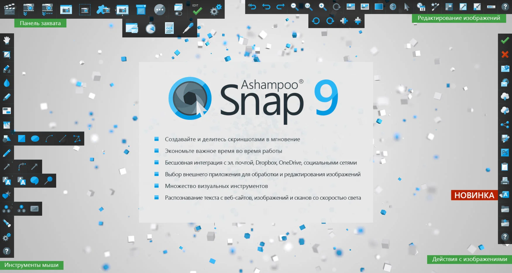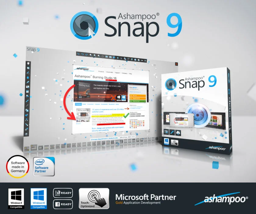 - Скриншоты - это только начало. Изображения и видео подают информацию более удобным, личным и кратким способом, по сравнению с текстом. Используйте Ashampoo Snap 9, чтобы создавать изображения и видео, которые расскажут Вашу историю именно так, как Вы хотели бы её рассказать! Отбросьте длительные разъяснения и создайте интуитивные, выразительные изображения всего несколькими кликами.
