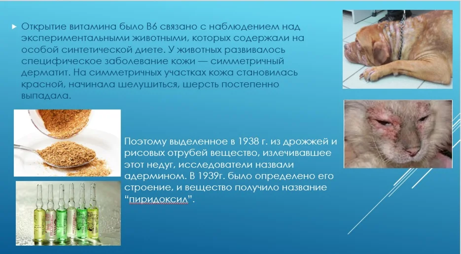Открытие витамина было В6 связано с наблюдением над экспериментальными животными, которых содержали на особой синтетической диете. У животных развивалось специфическое заболевание кожи — симметричный дерматит. На симметричных участках кожа становилась красной, начинала шелушиться, шерсть постепенно выпадала.