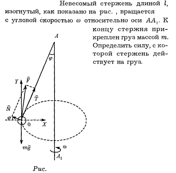 Невесомый стержень длиной l, изогнутый, как показано на рис. IV., вращается с угловой скоростью w относительно оси АА1. К концу стержня прикреплен груз массой m. Определить силу, с которой стержень действует на груз.