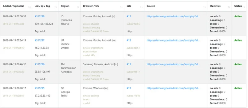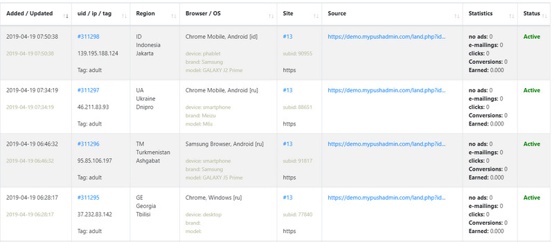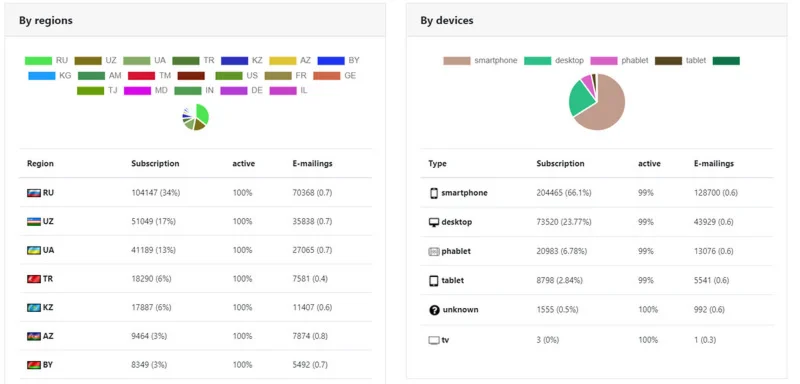 - вы видите всю информацию по своим подпискам, из каких они городов, устройств, страниц подписались и их статус подписки