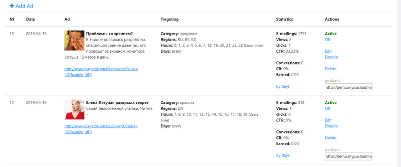 - добавляйте свои объявления со всеми возможными таргетингами для монетизации базы по CPA