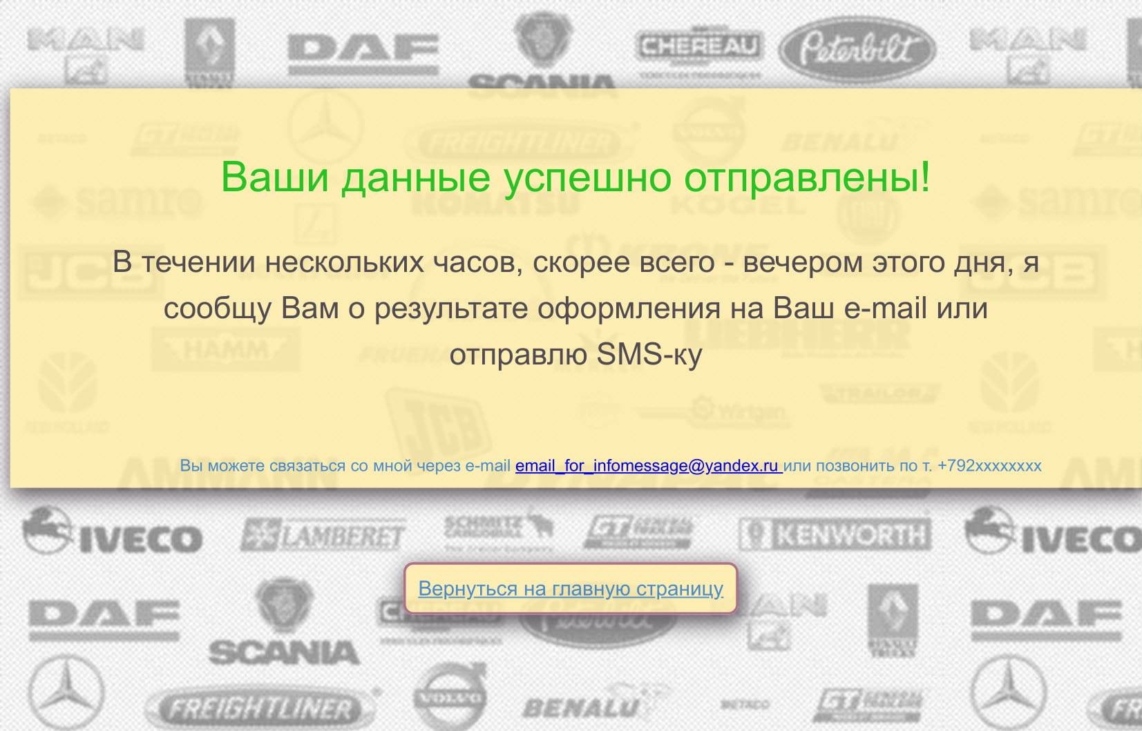 Сайт представляет собой электронную анкету, в которую пользователь, желающий застраховать свое транспортное средство, вносит данные, необходимые для оформления полиса ОСАГО. После успешного заполнения анкеты пользователь увидит сообщение об успешной отправке данных для получения страховки и текстом: "В течении нескольких часов я сообщу Вам о результате оформления на Ваш e-mail или отправлю SMS-ку".