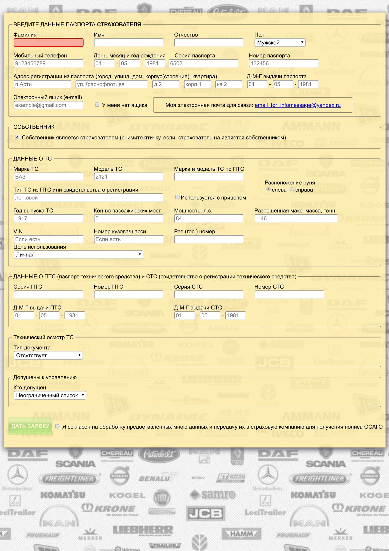 Данные отправляются электронным письмом на вашу почту, вы страхуете транспортное средство пользователя, затем оповещаете его об этом.
