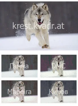 Схема для вышивки крестом "Белый волк бежит по снегу". Содержит схему в 4 вариантах для мулине фирм: "DMC", "Madeira", "Киров", "Гамма".