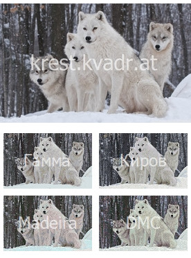 Схема для вышивки крестом "Стая Волков в зимнем лесу". Содержит схему в 4 вариантах для мулине фирм: "DMC", "Madeira", "Киров", "Гамма".