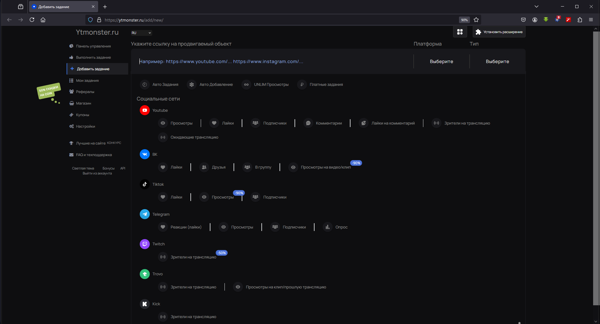 Купон YTmonster .RU 100 000 coin / YouTube, Instagram, TikTok, Telegram, VKontakte, Trovo, Kick.