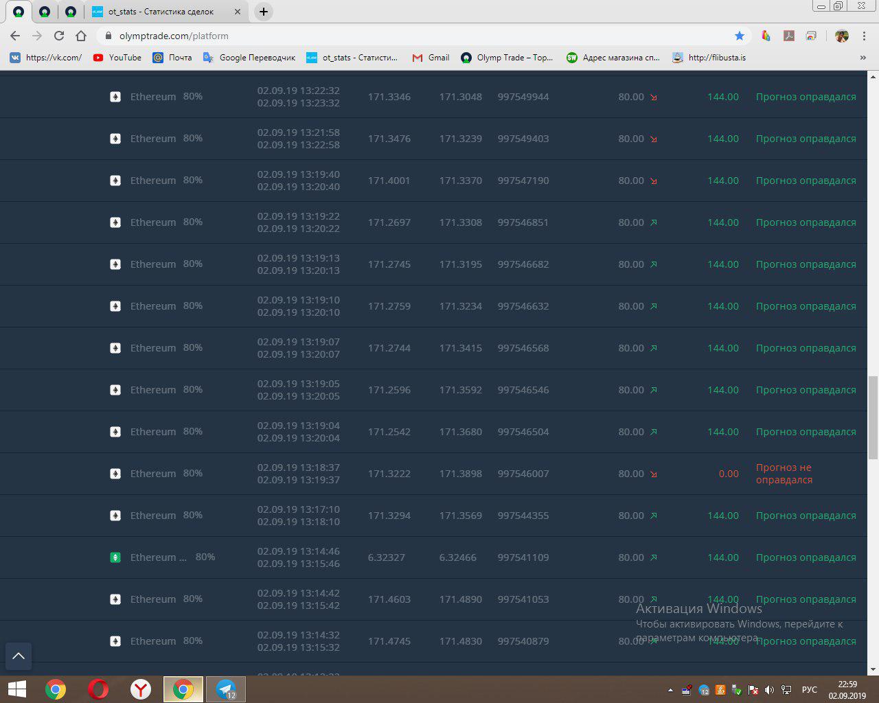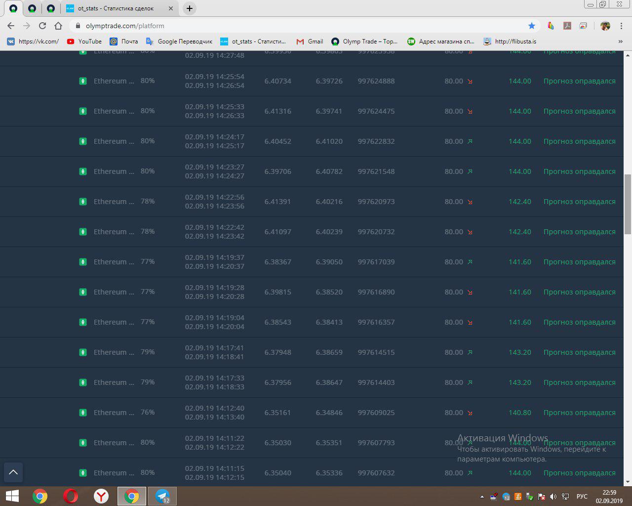 Прикладываю скриншоты с совершёнными программой сделками и результатами торговли.