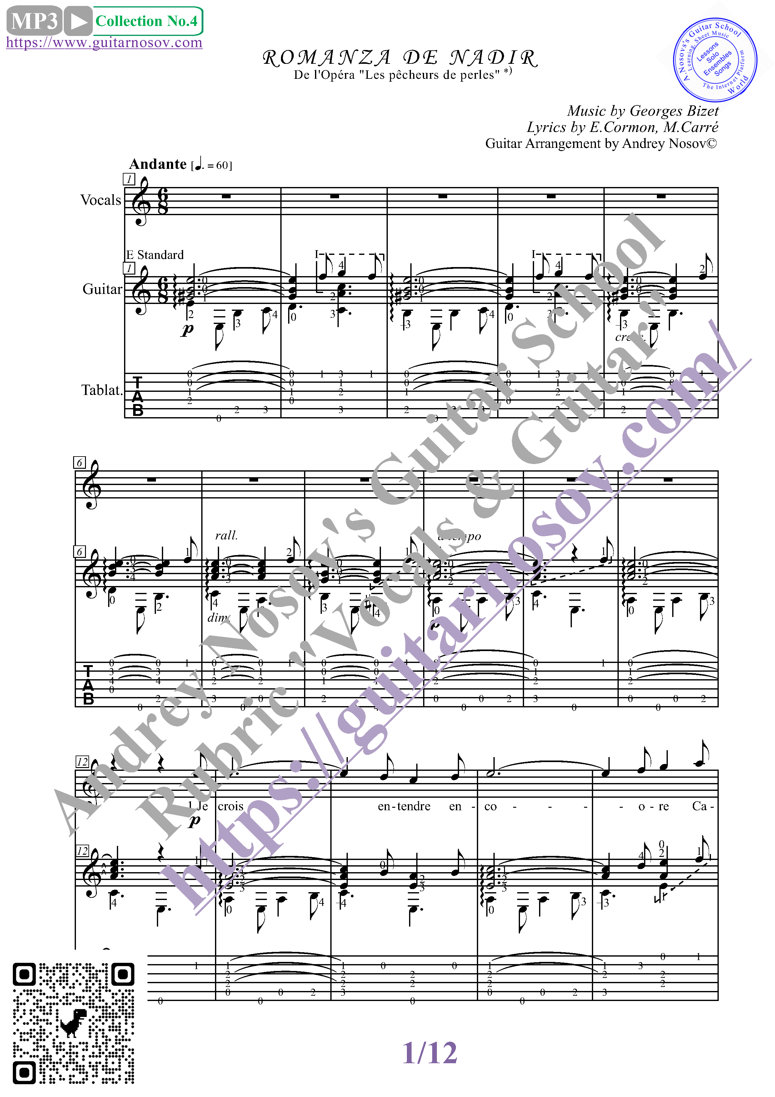 Вашему вниманию предлагается композиция "Romanza de Nadir (mus.G.Bizet, lyr. E.Cormon, M.Carré)", предназначенная для вокала в сопровождении 6-ти струнной гитары. Запись выполнена нотами и включает в себя партию вокала с подтекстовкой, партию гитары с подробнейшей аппликатурой и текст песни (НА ФРАНЦУЗСКОМ). Партия гитары продублирована табулатурой. Товар состоит из двух частей: 1 – Ноты с табулатурой; 2 – Ноты без табулатуры (в одном PDF). Прилагается ссылка на прослушивание / скачивание mp3.