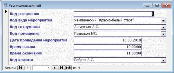 База данных "Спортивный клуб" предназначена для автоматизации работы спортивного клуба «Спартак». Позволяет обрабатывать информацию о абонементах, клиентах, группах, видах мероприятий, предприятии, подразделениях, помещениях, сотрудниках, должностях и расписании мероприятий.