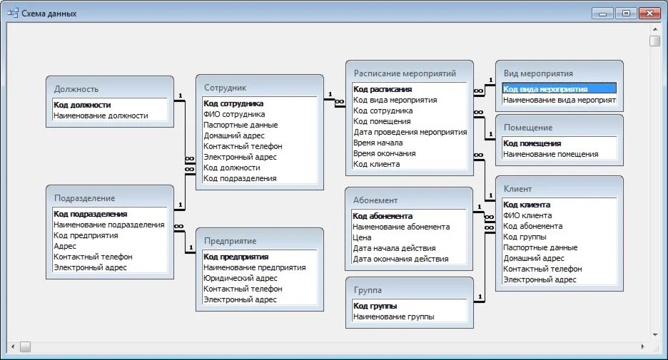База данных "Спортивный клуб" содержит следующие таблицы: абонемент; клиент; группа; вид занятия; предприятие; подразделение; помещение; сотрудник; должность; расписание занятий.