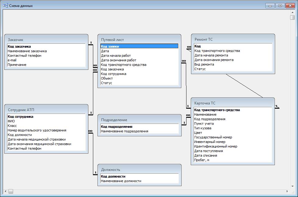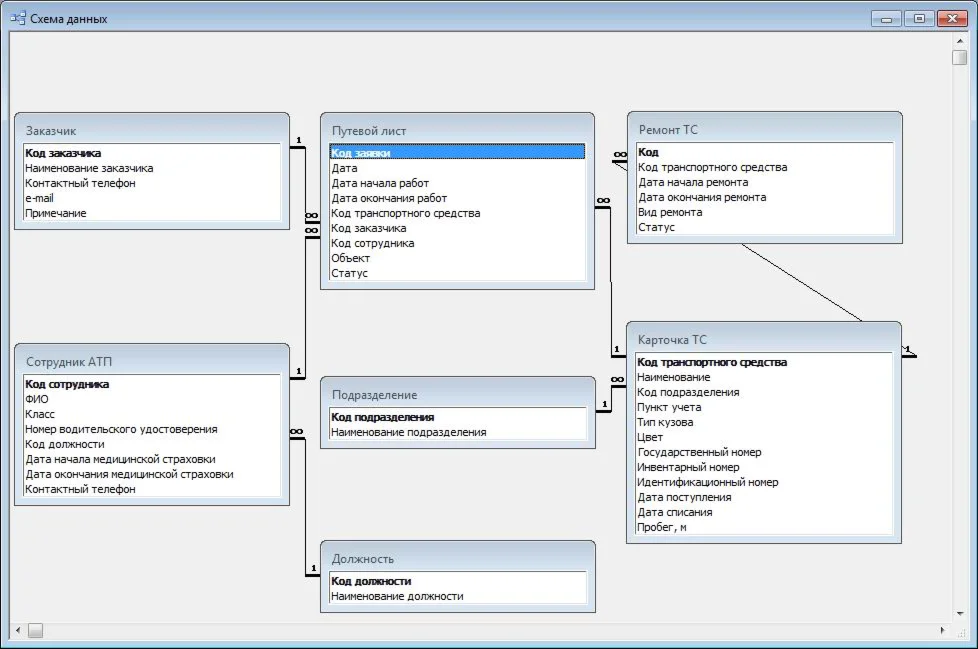 База данных "Учет путевых листов" содержит следующие таблицы: заказчик; сотрудник; подразделение; должность; карточка транспортного средства; путевой лист; ремонт транспортного средства.