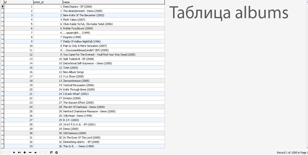 База данных состоит из трёх связанных таблиц: artists{id, имя исполнителя, первая буква названия исполнителя}, albums{id, id_артиста, название альбома}, songs{id, id_артиста, id_альбома, название песни, текст песни на родном языке}. (см. рис.)