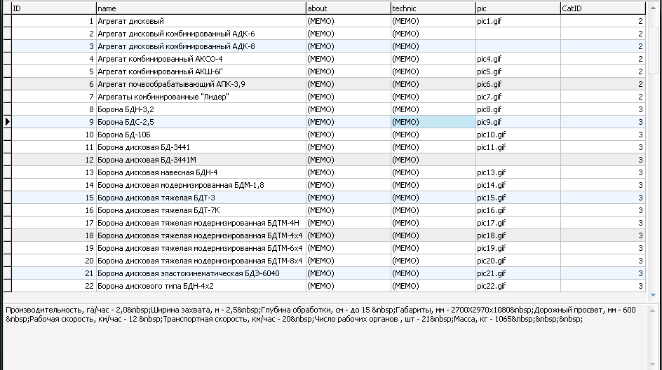 База содержит описания различных агрегатов (Бороны, Ботвоуборочные машины, Ворошилки, Жатки,Агрегаты для почвообработки) в 35 категориях, с их описанием и изображением (рисунки чистые, без водяных знаков), а также таблицу со статьями о разведение домашнего скота.