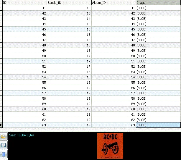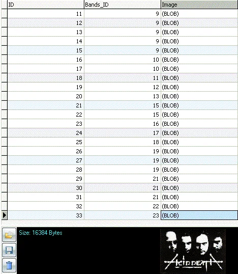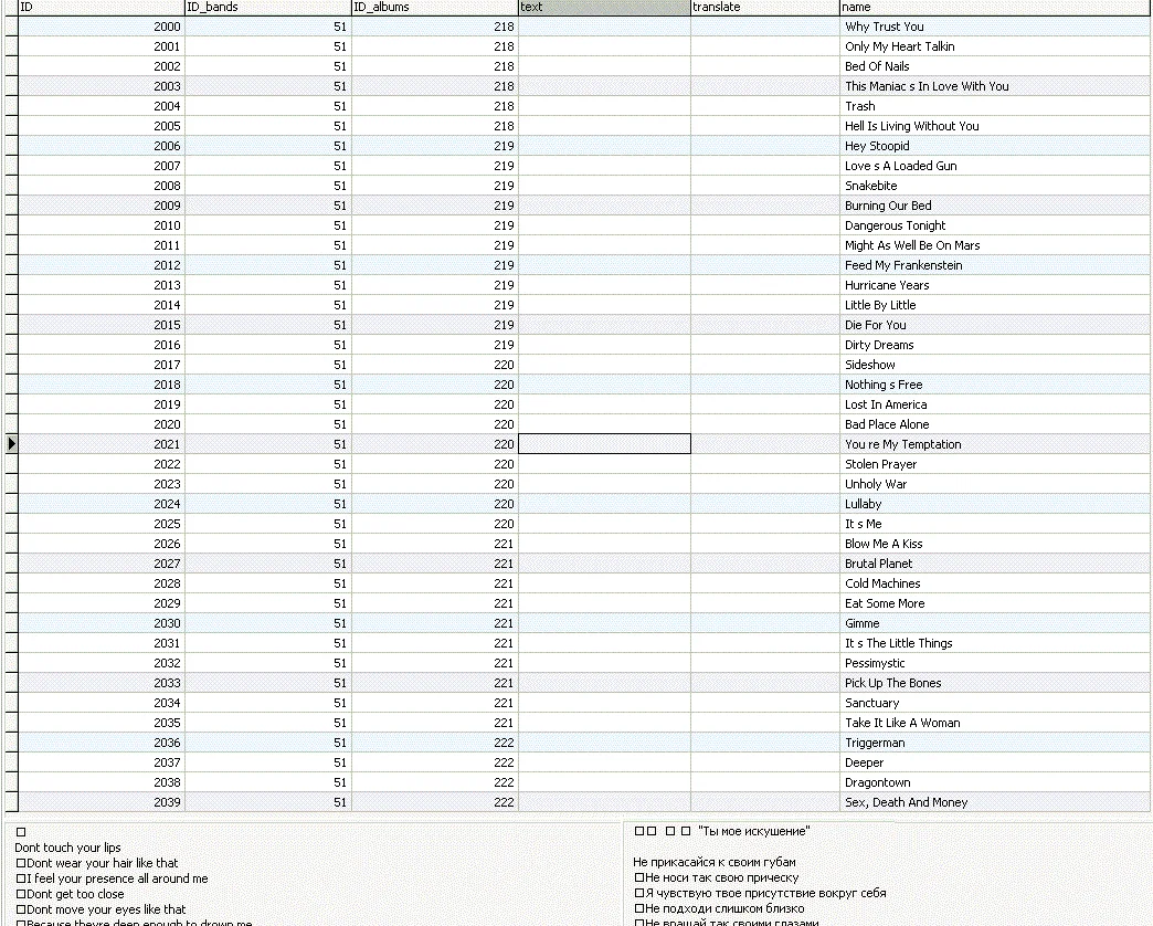 База состоит из 6 таблиц: bands(список групп), bandsimage(фотографии коллектвов), albums(альбомы групп), albumimage(обложки альбомов 300X300), albumimagethumb(thumb-ы обожек альбомов 100X100), songs(песни из альбомов, с текстом на родном языке и с переводом).
