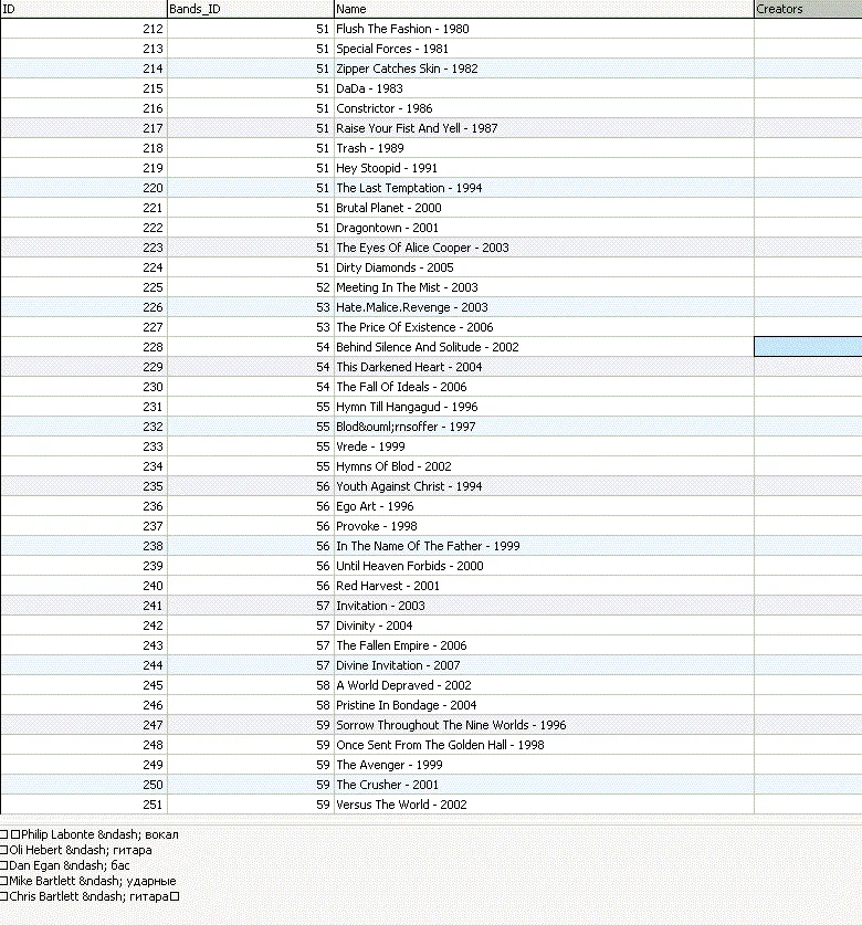 Магазин » MySQL dump базы данных дискографии всех рок групп