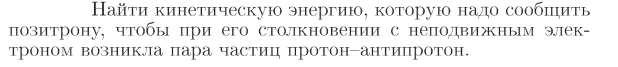 Найти кинетическую энергию, которую надо сообщить позитрону, чтобы при его столкновении с неподвижным электроном возникла пара частиц протон-антипротон.