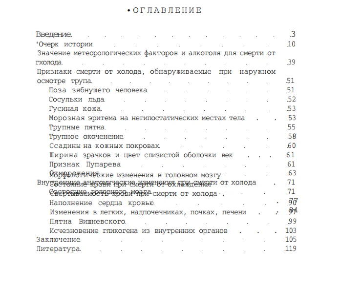Основное внимание в книге уделено вопросам секционной диагностики смерти от охлаждения. На основании исследований коллектива кафедры судебной медицины Т М И и литературных данных дается анализ диагностической ценности каждого из признаков холодовой смерти и всего комплекса их в целом.